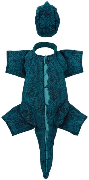 Remember to measure your pet for the paw-fect fit. Itโs been some millennia since weโve seen a dinosaur costume this cool! It comes with two pieces, a dino head โhatโ and the dino body complete with tail and scaly-looking fabric. Theyโre easy to put on and take off with neck and belly straps with hook and loop fasteners, and are designed to be worn by dogs and cats. The trick-or-treat fun wonโt go extinct with your pal dressed up as this prehistoric playmate.