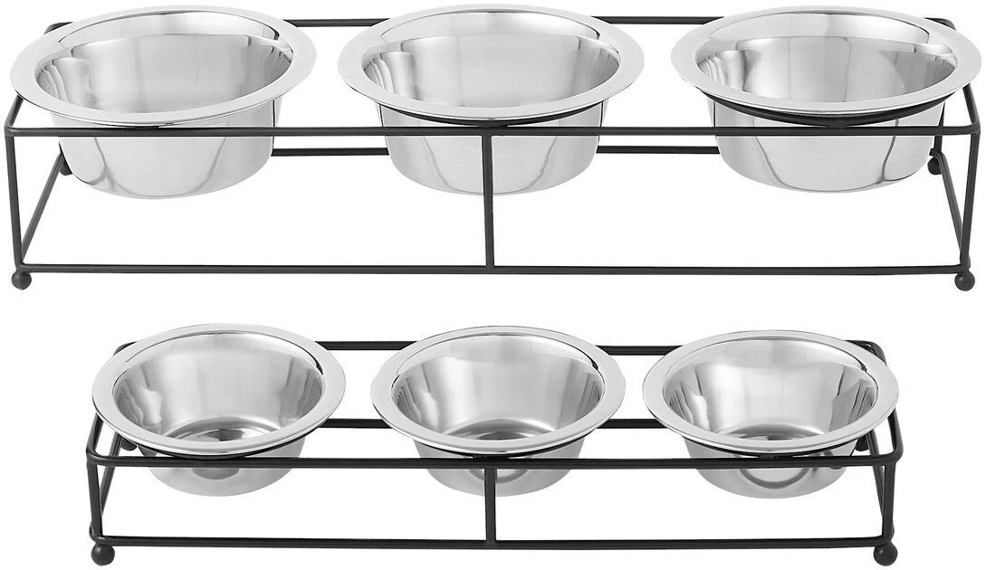 elevates dinnertime for your dog or kitty and gives you three feeding options in one. The durable iron stand keeps bowls where pets want them, and the straight design makes it ideal for any room of the house. Hand wash the removable stainless-steel bowls or throw them in the dishwasher for easy cleaning.