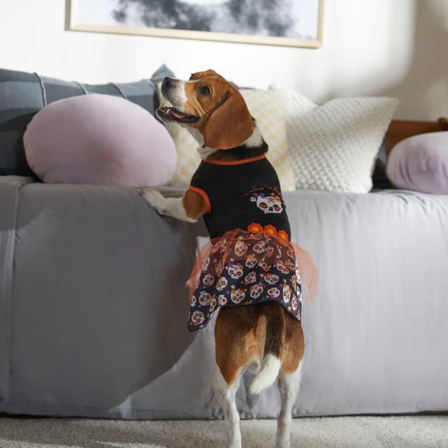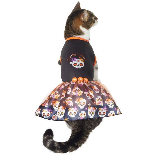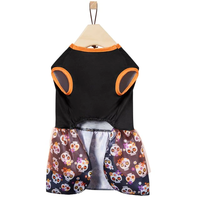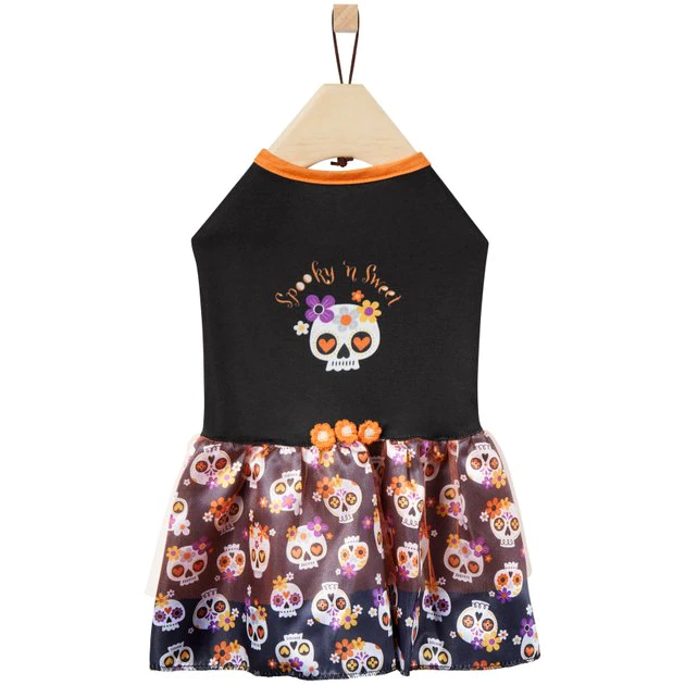 Your furry friend is going to look pretty scary on Halloweenโemphasis on prettyโ in this sweet and spooky ruffle skull dress, from Frisco, by Chewy! Theyโre going to be the center of attention at the Halloween party fur sure. It looks great on both dogs and cats and comes in a variety of sizes so that everyone can look their best for the festivities. This dress features a tank-top style that comes in black and orange, with a skull print on the body and all over the ruffle-styled skirt. Thereโs no missing your pet in this dress! The pullover style makes getting in and out simple and fast, then when youโre done, just toss it in the washing machine to clean for next time.