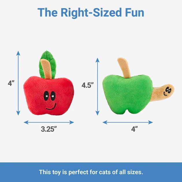 - Two plush toys in one for kitty—a red apple and a green apple with a wormy surprise.