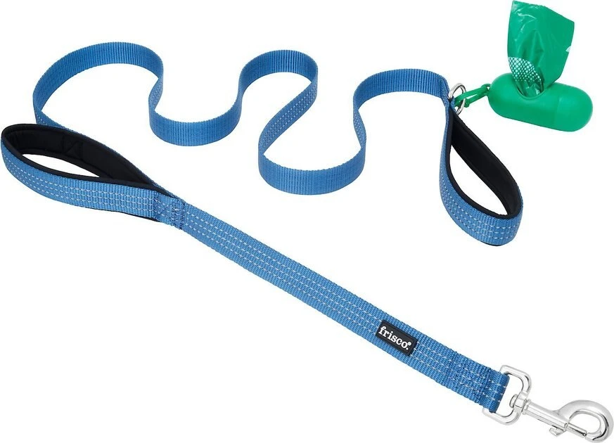 Whether youโre training your pup or taking on the town together, you wonโt want to leave the house without this Frisco Traffic Leash with Padded Handles & Poop Bag Dispenser, Blue, Length: 6ft, Width: 1-in + Refill Dog Poop Bags, Scented, 120 count bundle! The leash features two padded handles, one for standard walking, plus a traffic handle to help maneuver and keep your pup close by. The reflective stitching makes it ideal for night walks so you and your pup can be visible. Plus, it even includes a nifty Frisco Poop Bag Dispenser thatโs perfect for the included Frisco Dog Poop Bags. They are made from durable, leak-proof plastic and have cardboard cores and packaging made from at least 50% recycled materials for a more environmentally friendly option.