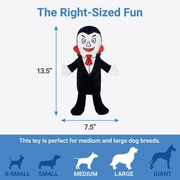 Some toys go crunch in the night. Some toys go squeak too. This one will make your pup say “eek!” from all the ghoulishly good times they can have together! On the outside, this vampire seems like a regular plush toy—soft and cuddly. On the inside, though, this frightening friend is hiding a crunchy secret: a plastic bottle that dogs love to crunch. Fill your pup’s Halloween with the spooktacular sounds they love with this toy!