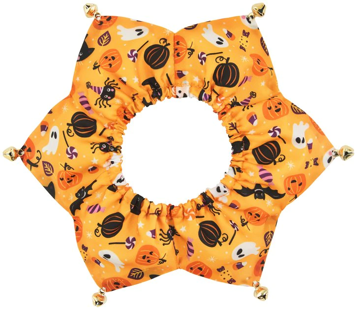 This Halloween, take kitty cuteness to the next level with this adorable ruffle collar from Frisco! With its built-in elastic, itโs so easy to put on and comfy enough for any cat to wear it through all the Halloween fun. Just stretch it a bit and put it over your catโs head. It has less-than-spooky (but surely spook-tacular) pumpkins, ghosts and cats, with classic Halloween colors and jingly bells at the points, so you wonโt only see their Halloween joy, but hear it too! Whether they wear it alone as a Halloween costume or as a complement to your spooky getup, this ruffle is purr-fect.