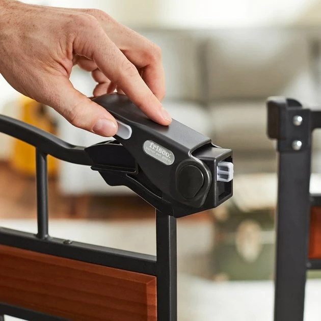 Check out the Size Tab to be sure this gate fits your doorway. Turn any room in the house into a safe zone, and add a little flair too, with the Frisco Wood Accents Extra Tall Auto-Close Pet Gate. Made with a durable all-steel construction and stylish wooden accents, this gate is designed to keep your pet safely contained by simply installing it in a door frame or hallway. The pressure mount system makes setting it up and taking it down easy, so you can move it to different areas of the house as you need. The gate door works double duty by staying open when you need it toโjust open it past 90 degrees to lock it openโor otherwise closing on its own. You can also set up the door to open to any side. The dual-lock safety release means your pal canโt get crafty and open the door, adding a layer of security. Plus, this gate is lightweight so you can transport it and store it easily.