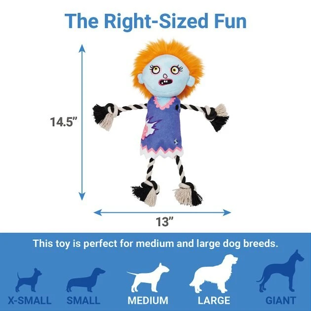 They’re alive! This super cute zombie toy is always ready for playtime. With a soft, plush body, your pup will love giving it a really good squish. The knotted rope in the arms and legs makes for a ghoulishly good time and interactive fun with you. Toss it, wiggle it, play fetch, too! This zombie cutie goes squeak in the night with two internal squeakers so you can turn up the spooky fun for all their Halloween games.