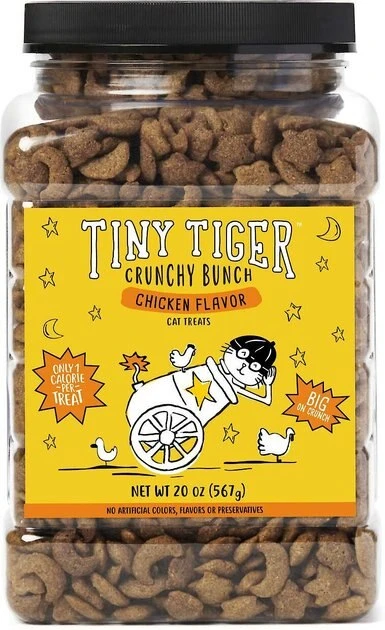 - Tiny Tiger Crunchy Bunch, Chicken Cannonball, Chicken Flavor Cat Treats pack a big crunch to scrub teeth and satisfy kittyโs cravings for crunchy snacks.