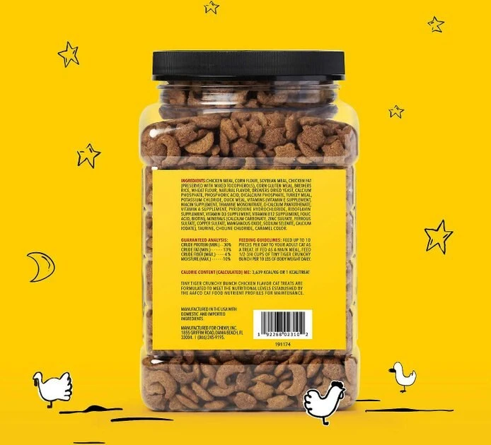 - Tiny Tiger Crunchy Bunch, Chicken Cannonball, Chicken Flavor Cat Treats are only 1 calorie per treat so you can make snack time part of a healthy, balanced diet.